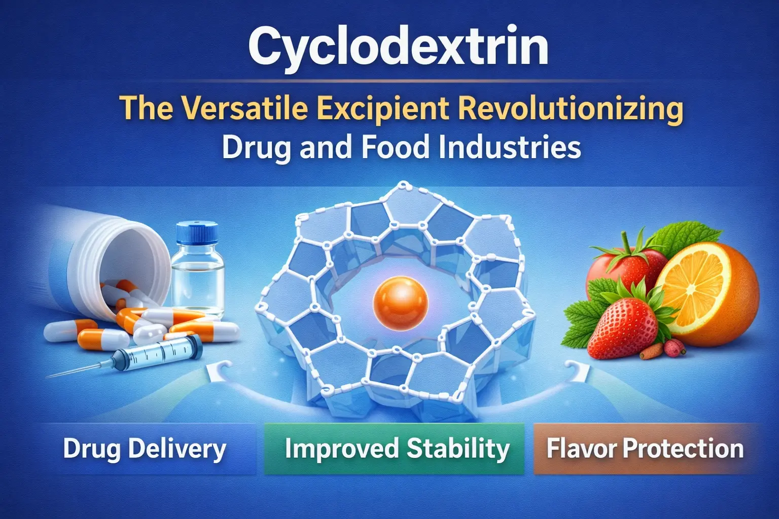 El descubrimiento de la ciclodextrina es uno de los pasos más importantes en la historia de la alimentación y la medicina. Este oligosacárido cíclico natural ha cambiado la forma en que administramos medicamentos, mantenemos los alimentos frescos y utilizamos muchos otros productos químicos en la industria. El producto produce complejos de inclusión que abordan problemas importantes en muchos campos gracias a su estructura molecular distintiva, que tiene una cavidad interior hidrófoba y una superficie exterior hidrófila. Este excipiente flexible está cambiando la ciencia de formulación y los procesos de fabricación en todo el mundo. Puede hacer de todo, desde mejorar la absorción de medicamentos hasta ocultar el mal sabor de los medicamentos.